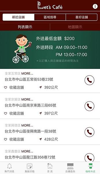 一樣可以看離自己最近而且有咖啡外送的店家, 或者某個特定區域的店家